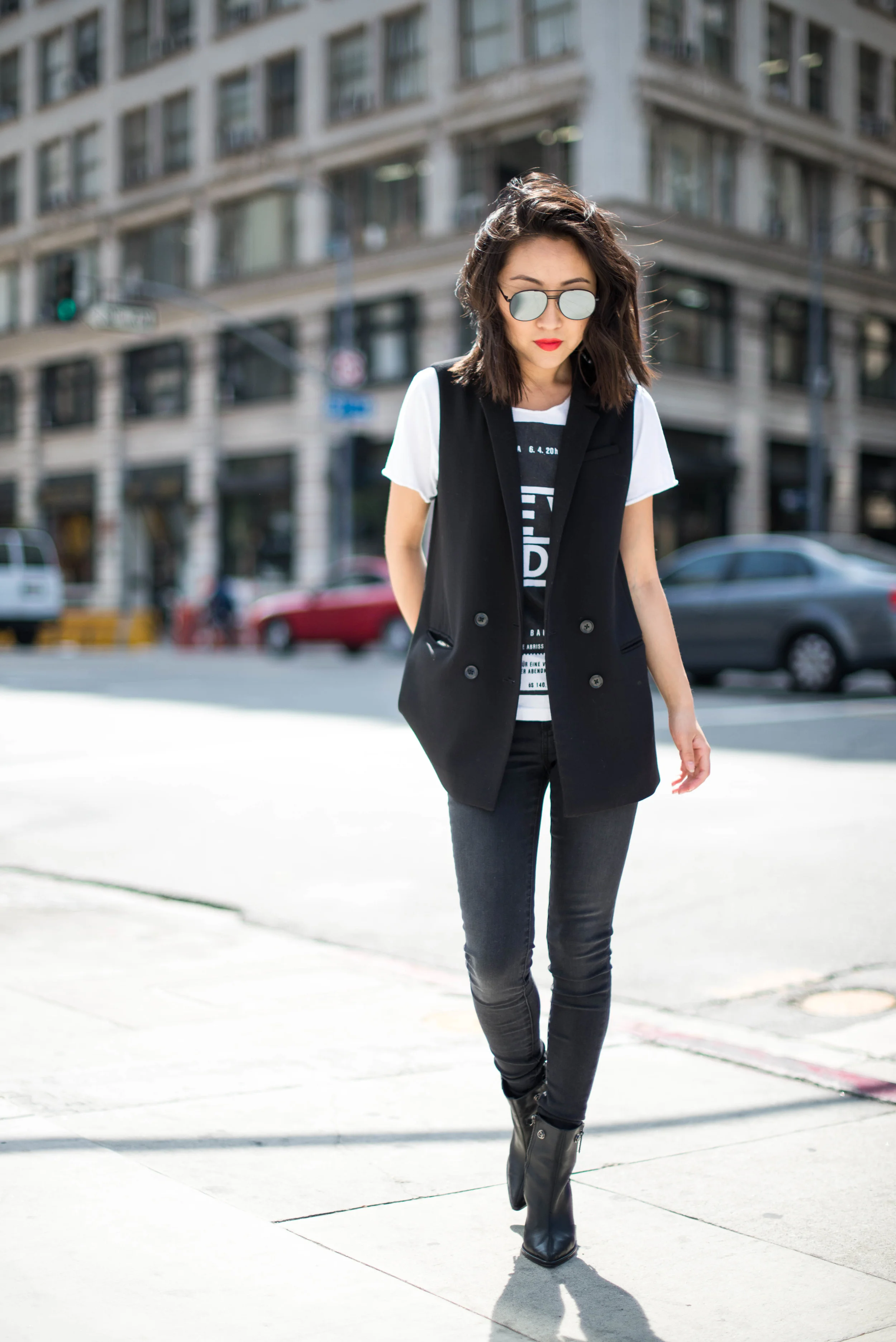I styled 2 looks for this post, one a bit more dressy, with yellow pumps, and a white blouse. the second, an edgier look, with a graphic tee, black booties and black vest.
